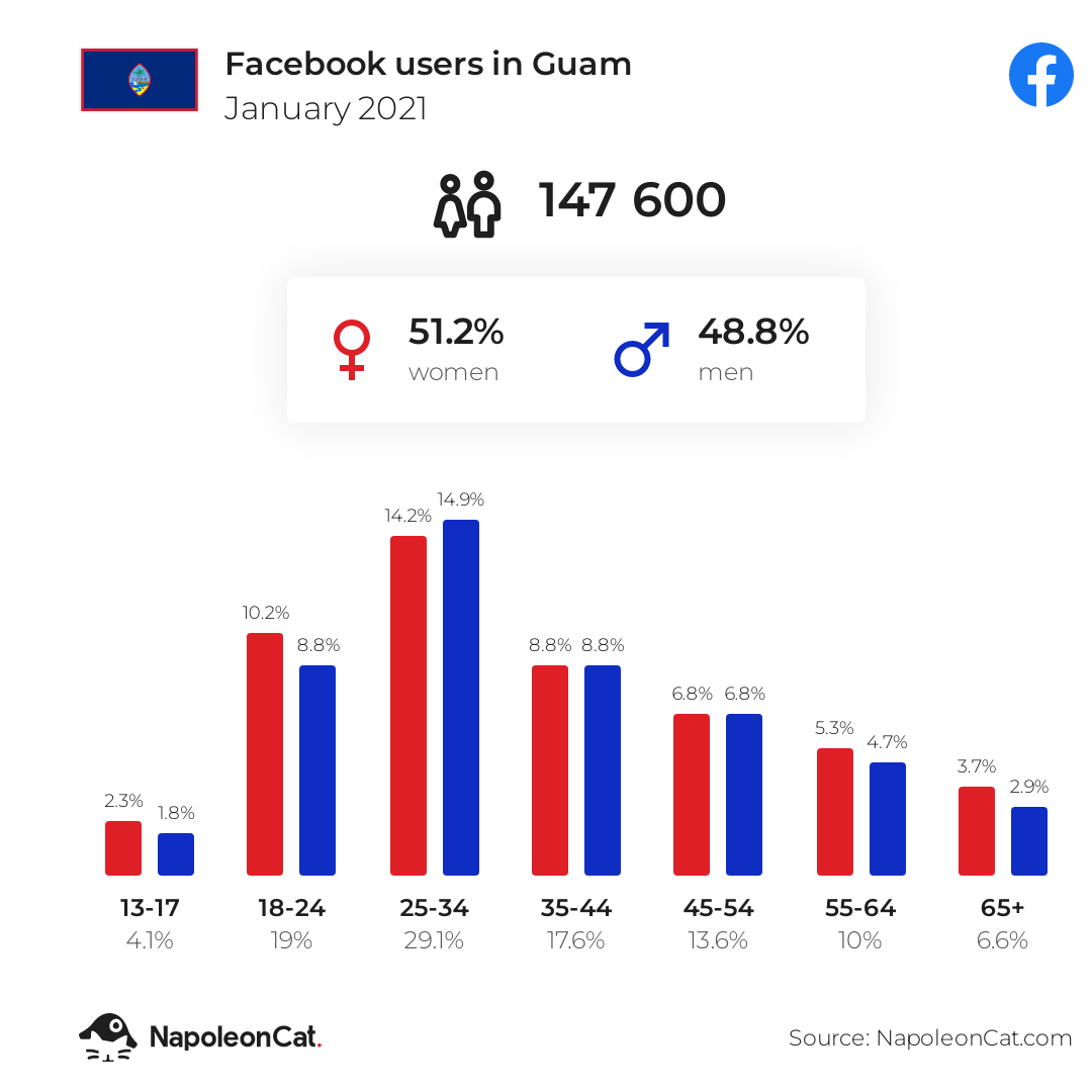 There were 147 600 Facebook users in Guam in January 2021, which accounted for 86.3% of its entire population.