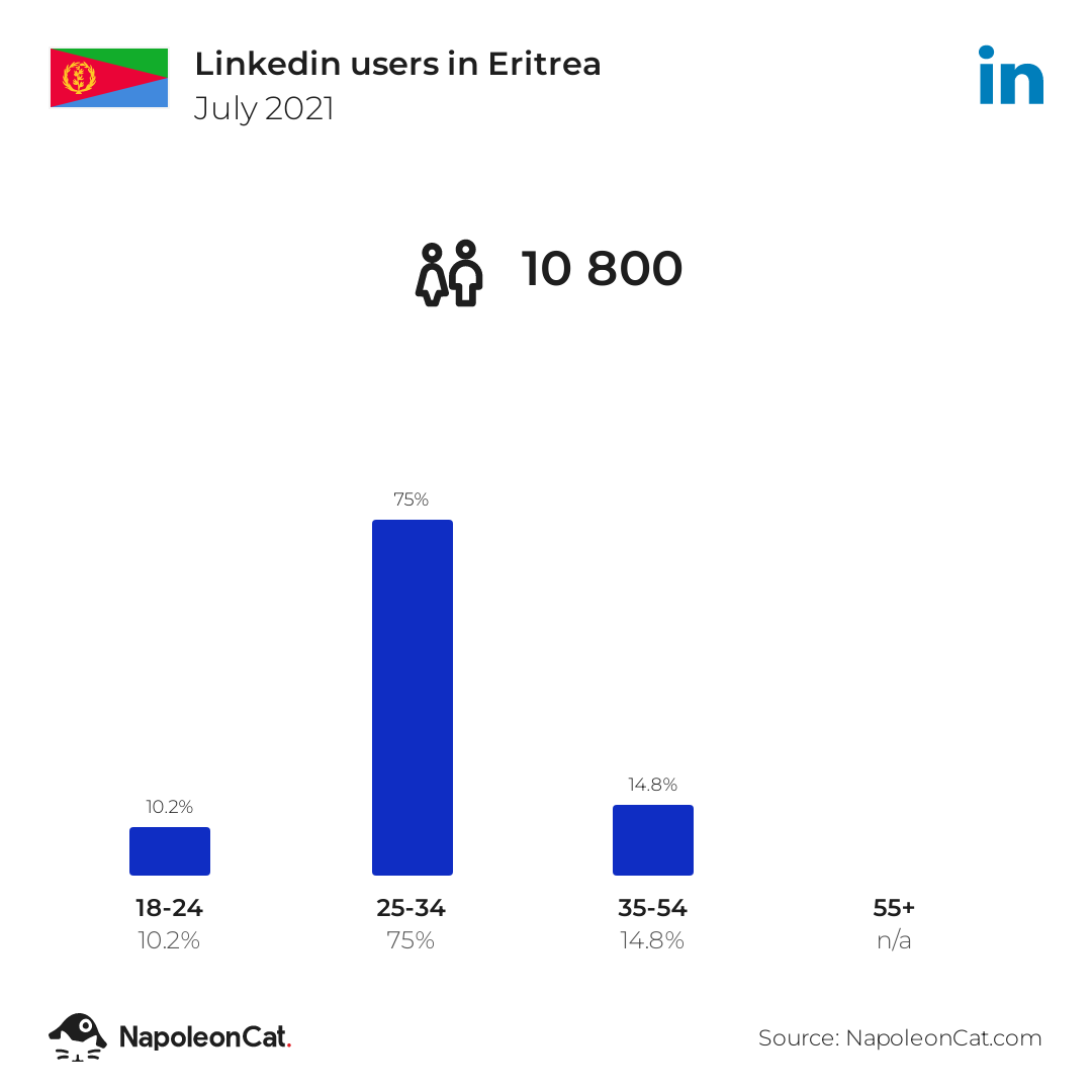 There were 10 800 Linkedin users in Eritrea in July 2021, which accounted for 0.2% of its entire population.